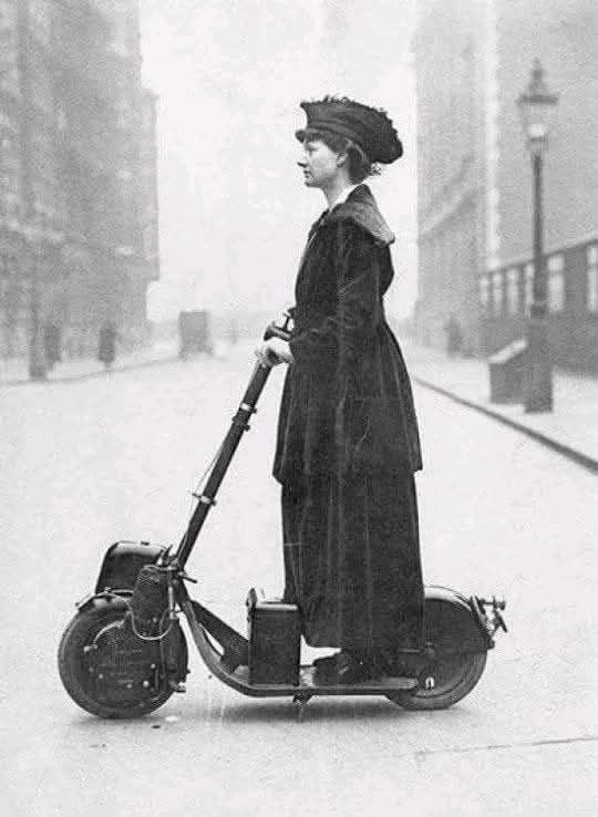 Në foto është Zonja Florence Norman, një sufrazhetë, me motorin e saj Autoped në vitin 1916, duke udhëtuar për të punuar në zyrat në Londër ku ishte mbikëqyrëse. Skuteri ishte një dhuratë për ditëlindje nga bashkëshorti i saj, gazetari dhe politikani liberal Sir Henry Norman.
