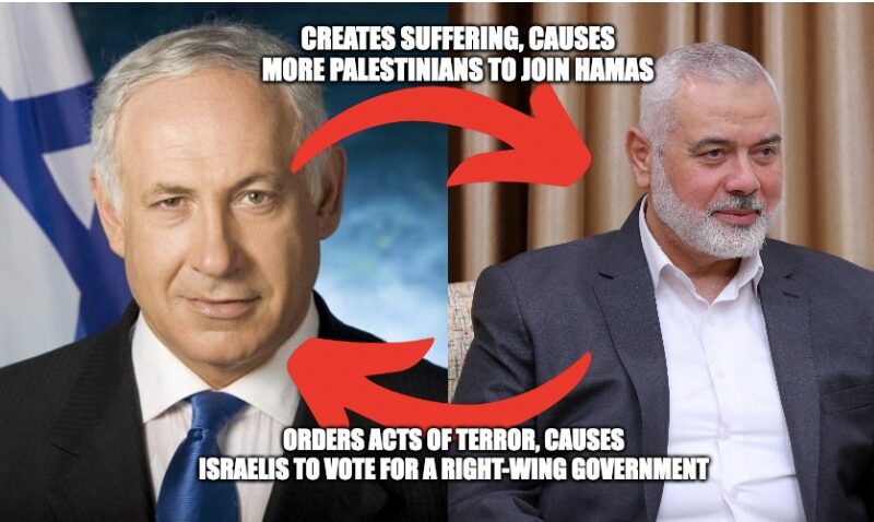 A e ka përmendur dikush këtë marrëdhënie simbiotike? Në foto Ai në të majtë është Benjamin Netanyahu, kryeministri i Izraelit, ndërsa ai në të djathtë është Ismail Haniyeh, udhëheqësi i Hamasit. Duke u bazuar në faktet e shpërfaqura më lartë rezulton se, veprimet e secilit prej tyre përfitojnë nga njëra-tjetra. Benjamin Netanjahu: (Izraeli) Krijon vuajtje në mënyrë që sa më shumë palestinezë të bashkohen me Hamasin. Ismail Haniyeh: Urdhërat e akteve terroriste (të Hamasit) bëjnë që izraelitët të votojnë për një qeveri të krahut të djathtë (sionist izraelit).