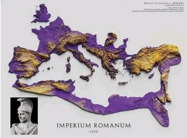 Kjo hartë e bukur topografike 3D tregon shtrirjen e Perandorisë së madhe Romake të vitit 117 pas Krishtit nën Perandorin Trajan (i lindur më 18 shtator 53 dhe vdes më 9 gusht 117) . Perandori Trajan i Romës sundoi nga viti 98 deri në vitin 117 pas Krishtit.