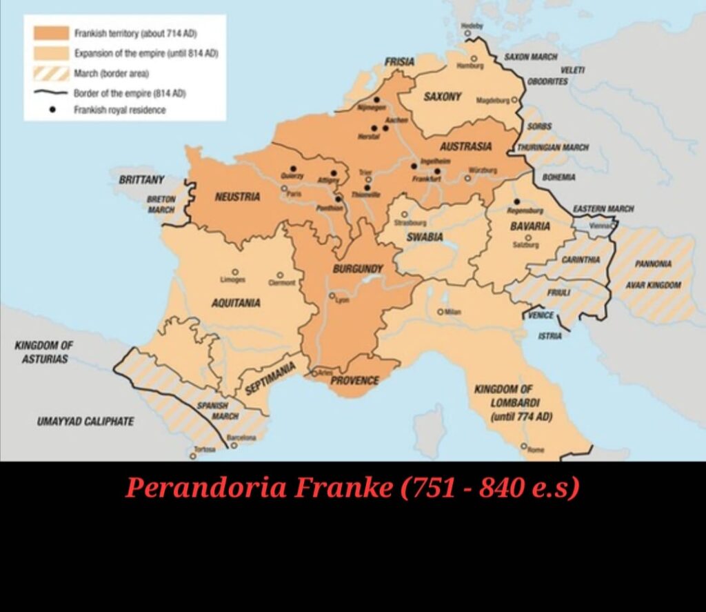Duke filluar me Karlin e Madh (i kurorëzuar Perandori i Shenjtë Romak nga Papa Leo III në vitin 800 të es) Frankët sunduan perandorinë më të madhe evropiane të kohës derisa shpërbërja e saj krijoi tre mbretëri në vitin 840 të e.s.:
