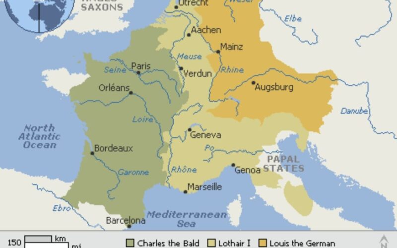 Gjatë shekujve të VIII-të dhe të IX-të, frankët krijuan një mbretëri të madhe në Evropën Qendrore dhe Perëndimore. Në ditën e Krishtlindjes, 800, mbreti frank, Karli i Madh, ishte kurorëzuar si perandor në Romë. Megjithatë, nën nipërit e tij, mbretëria franke u shpërbë me shpejtësi. Ata ranë dakord të ndanin perandorinë në tre pjesë: