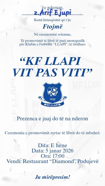 Që në momentin kur Esad R. Ejupi, autor i kësaj monografie, e shtroi idenë për të përmbledhur në një libër të vetëm historikun e Klubit Futbollistik Llapi të Podujevës, i kam premtuar se do ta ketë përkrahjen time të parezervë.