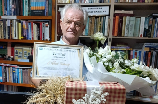 Ju që vlerësoni mua [Federata e Paqes Universale] si Ambasador i Paqes me çertifikatën: “MIRËNJOHJE” (me rastin e daljes në pension) “Për kontributin e dhënë si studiues, bibliograf, poet, shkrimtar dhe recensues; si drejtor i Bibliotekës Shkencore “Nermin Vlora Falaschi” pranë Universitetit “Ismail Qemali” dhe si kryetar i Shoqërisë së Shkrimtarëve dhe Artistëve “Petro Marko”, Vlorë” – zonja Eva Çipi, Kryetare e Këshillit Rajonal të Paqes Vlorë dhe z. Gani Rroshi, Sekretar i Përgjithshëm i Federatës së Paqes Universale – qofshi të bekuar nga Ylli i Mirësisë që shndrit Yjësinë e Paqes Universale, se ne misionarë drite jemi, se familja është shkolla e dashurisë dhe paqes, se standardi më i lartë i të jetuarit është jeta për hir të tjetrit.