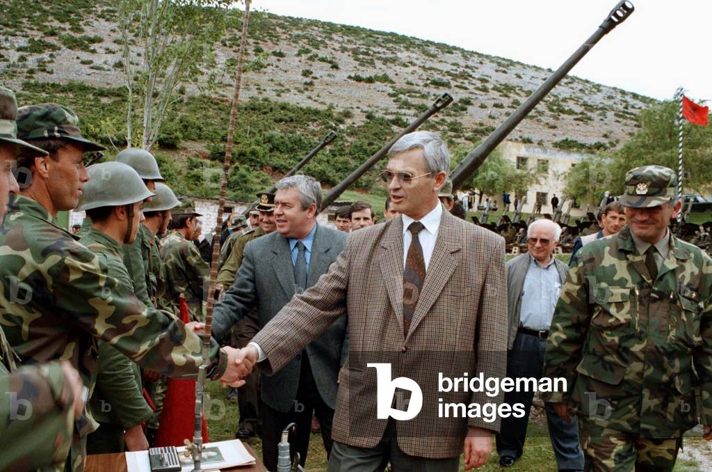 REU8116437 ALBANIAN PRESIDENT REXHEP MEIDANI INSPECTS ARMY TROOPS IN KUKES, 1998-05-26 (photo); (add.info.: Albanian President Rexhep Meidani inspects a military unit in the northern town of Kukes, 240 km northeast of Tirana, bordering Serbia\’s province of Kosovo May 26. Albanian army units have been on high alert because of the bloody crisis in the neighbouring Kosovo province in which ethnic Albanians make up 90 percent of the 1.8 million population. Defense Minister Luan Hajdaraga is at left behind Meidani. LAZ/SB); REUTERS.