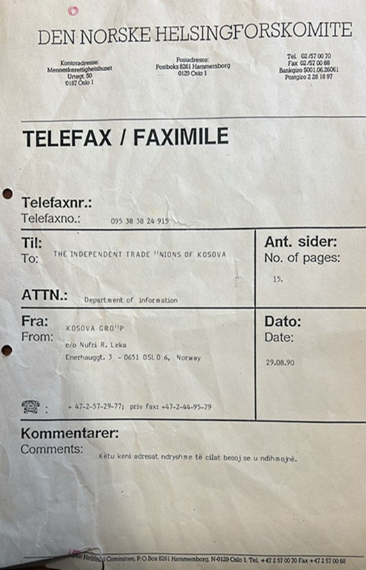Më tutje në vijim paraqiten gjashtë faksimile, të pa publikuara deri më tash. Faksimilja e parë përmban korrespondencën me faks të datës 29 gusht 1990, ndërmjet përgjegjësit të Grupit për Kosovën, në kuadër të Komitetit Norvegjez të Helsinkit (GKKNH), dhe Bashkimit të Sindikatave të Pavarura të Kosovës (BSPK) në krye me Hajrullah Goranin. Faksimilja e dytë është komunikata e datës 9 shtator 1990, e trupës iniciuese në Zvicër e udhëhequr nga Xhavit Hoxha, në lidhje me bashkimin e sindikatave të pavarura të Kosovës. Faksimilja e tretë përmban një informim të përgjegjësit të GKKNH-së lidhur me takimet e zhvilluara me sindikatat në Norvegji, të realizuara së bashku me Dukagjin Goranin, si dhe për një takim të veçantë të përfaqësuesit të GKKNH-së me një nga përfaqësuesit kryesorë të sindikatave të Lëvizjes Solidarnost. Faksimilja e katërt është letra e Dukagjin Goranit drejtuar Elez Biberajt, në të cilën përfshihet edhe referenca për vendosjen e kontaktit me Grupin për Kosovën në kuadër të Komitetit Norvegjez të Helsinkit. Faksimilja e pestë përbën një njoftim orientues dhe inkurajues të përgjegjësit të GKKNH-së, drejtuar shqiptarëve në Norvegji, me qëllim mobilizimin e tyre për të mbështetur BSPK-në. Ndërkaq, faksimilja e gjashtë paraqet një letër proteste kundër autoriteteve serbo-jugosllave, të hartuar nga njëra prej organizatave sindikaliste të Norvegjisë dhe të dërguar Ambasadës jugosllave në Oslo (Norvegji). Në këtë dokument, ndër të tjera, duke iu referuar OKB-së, KSBE-së dhe Konventës nr. 87 të ONP-së, kërkohet garantimi i të drejtave për organizimin e sindikatave të pavarura në Kosovë dhe dënohen burgosjet me motiv politik.