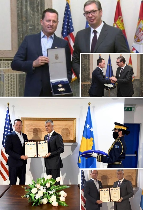 Sot në Beograd Presidenti i Serbisë (Gebellsi i Millosheviçit) Aleksandar Vuçiq, ia ka dorëzuar ish-emisarit të SHBA-së për dialogun Kosovë – Serbi, Richard Grenell, Urdhrin e flamurit serb, për “shërbime të dalluara në zhvillimin dhe forcimin e bashkëpunimit paqësor dhe të marrëdhënieve mes Serbisë dhe SHBA-së”.